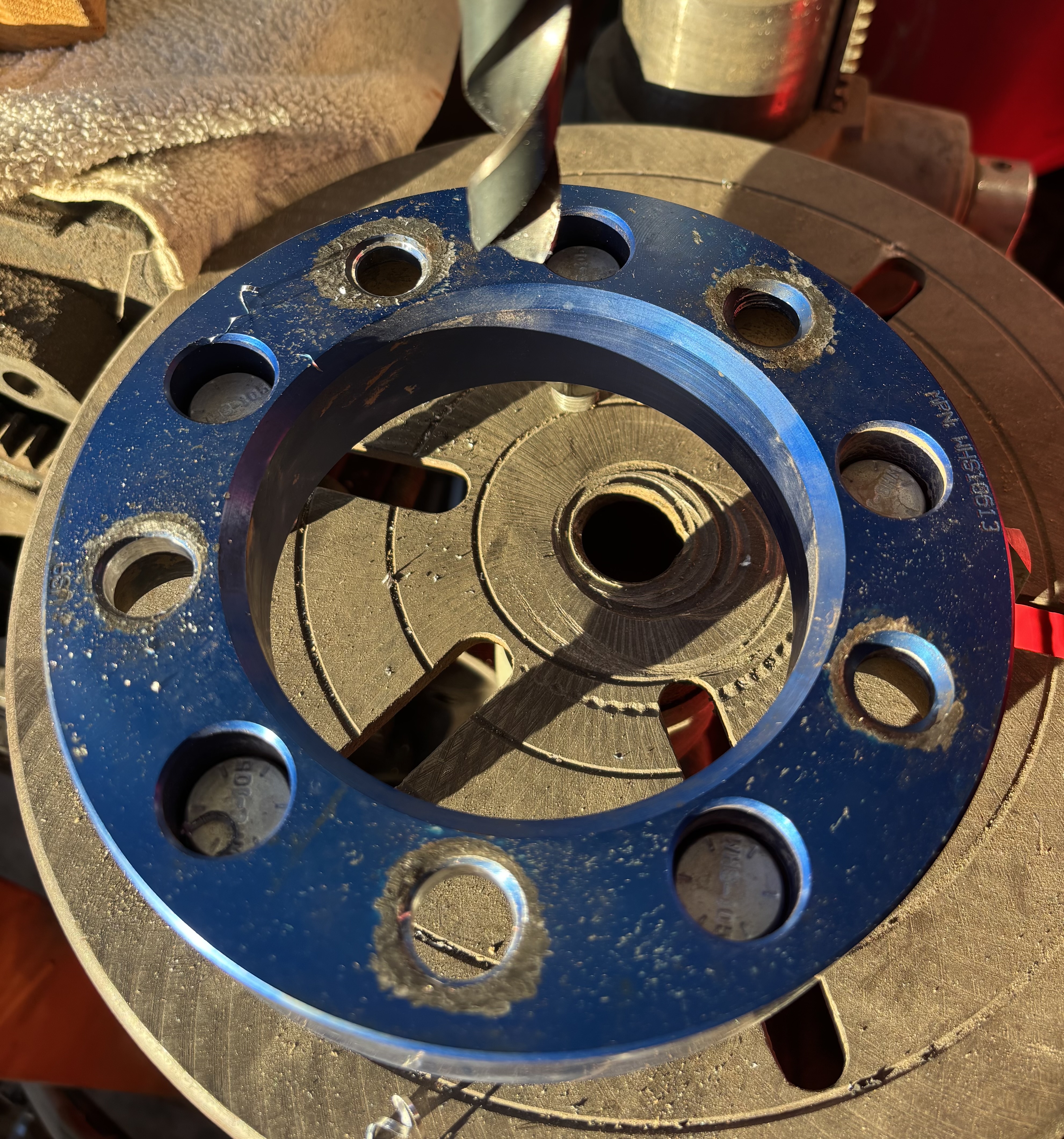 Once the rotors and hubs where married I test fit my Spidertrax wheel spacers and noticed that the holes in the wheel spacers where less than a 1/16” too small. A quick ride on the drill press and a 5/8” drill bit did the trick.